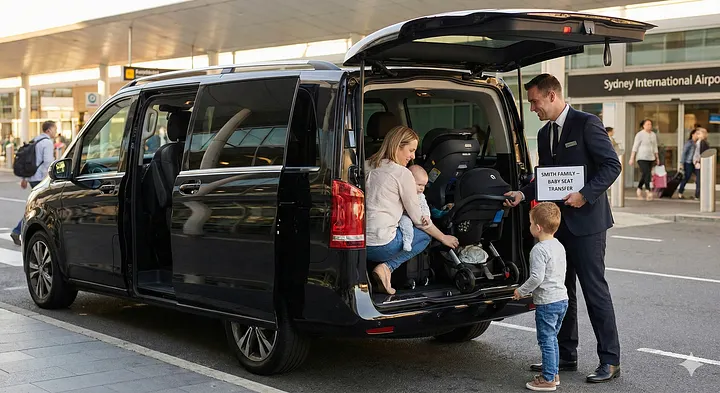 A Cars on Demand chauffeur provides a meet-and-greet service for the Smith family at Sydney International Airport, assisting with luggage and securing child seats for their pre-booked baby seat transfer in a luxury people mover.