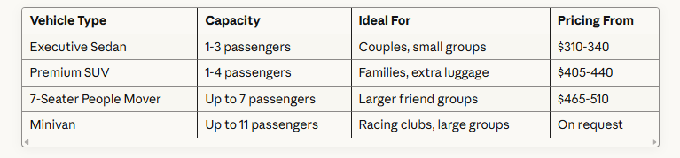 You’re welcome to bring soft drinks and non-alcoholic beverages for the journey. However, we don’t permit alcohol consumption in our vehicles. We want to ensure a safe, professional environment for all passengers and maintain our vehicle standards. You can celebrate the race with refreshments once you reach your destination!